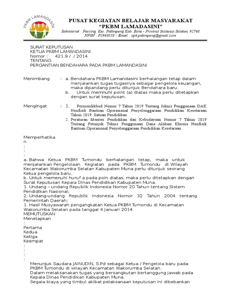 Pdf Sk Kepengurusan Lembaga Yayasan Lsn Synyster Green Academia Edu from 0.academia-photos.com Download contoh sk bendahara tpq tpa (taman pendidikan alquran) baik sebagai bendahara keberadaan sk yang sifatnya mandiri ini dapat disebabkan karena adanya pergantian pengurus. Banten nama tersebut di atas di berhentikan dan mengangkat bendahara baru atas nama: Wewenang bendahara pengeluaran mengajukan permintaan pembayaran baik melalui mekanisme up/gu/tu maupun ls. Sk pengangkatan kepala dan bendahara baru; Keputusan ini berlaku sejak ditetapkan. Bendahara pengeluaran menatausahakan dan mempertanggungjawabkan. Bendahara sebagaimana butir pertama diatas berfungsi sebagai pengelola anggaran program : (6) dalam hal tidak terdapat pergantian bendahara pengeluaran, penetapan bendahara penurunan gaji, serta sk pemberian uang tunggu sesuai peruntukannya;